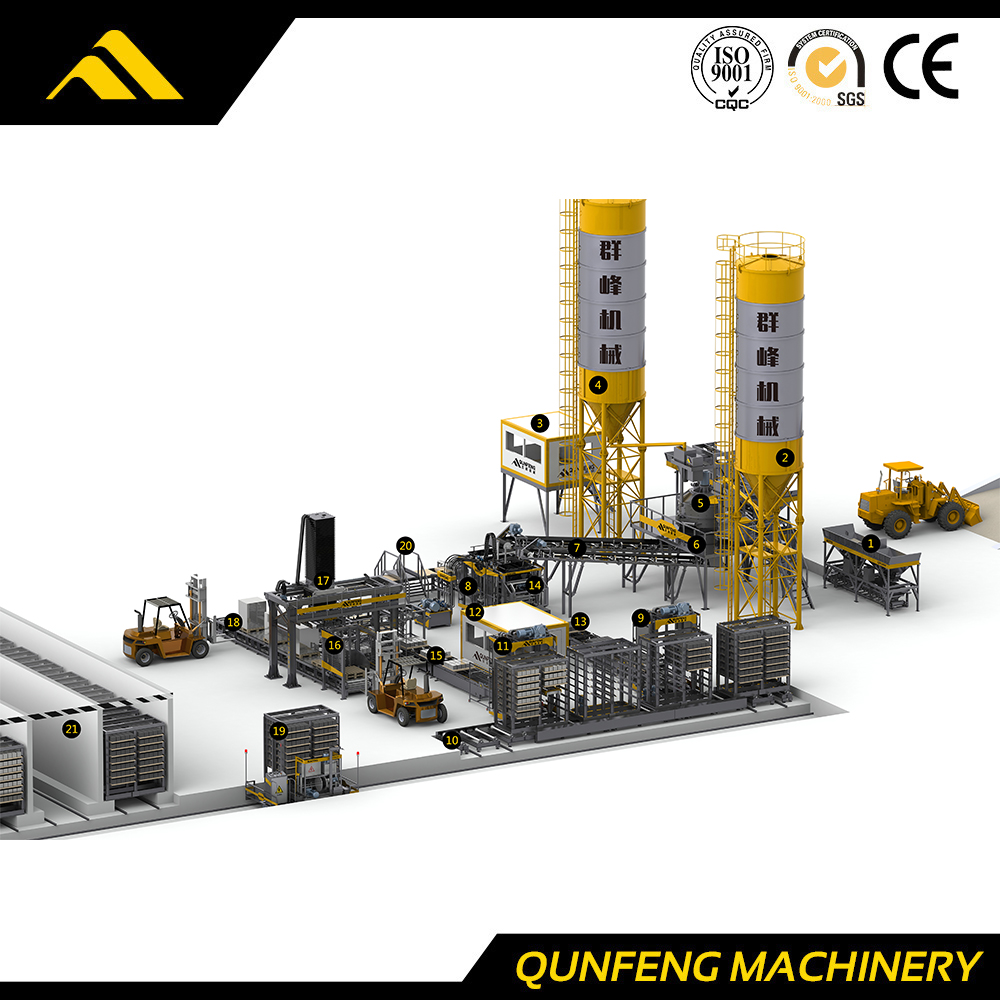 | 7. Cinta transportadora | 8.Máquina para fabricar bloques | 9. Ascensor | 10. Transportador de rejilla de curado | 11. Bajador | 12. Sistema de control central |